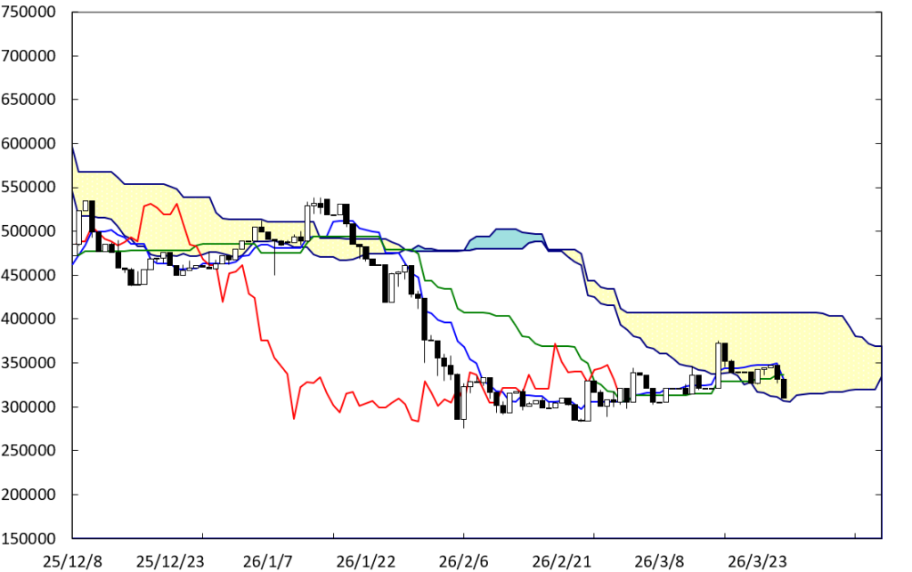 赤線の遅行スパンが26日前のローソク足に接している。ここで、ローソク足を割り込むことになるのか否かは重要である。また、現在値も雲の下限に到達している。したがって、雲の下限が下値支持線になるのか否かも重要である。割り込むと弱気が広がることになる。