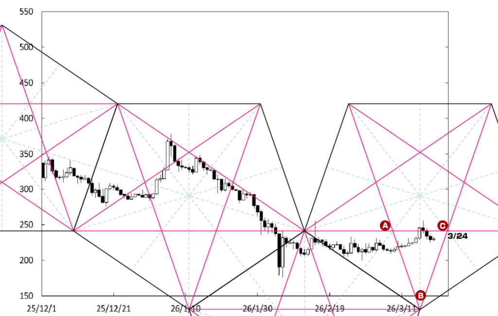 C点に注目したい。先週末にC点が位置する時間帯に到達した。したがって、同点が位置する時間帯が変化日となり、新しい動きが出てくるのか否かがポイントになる。