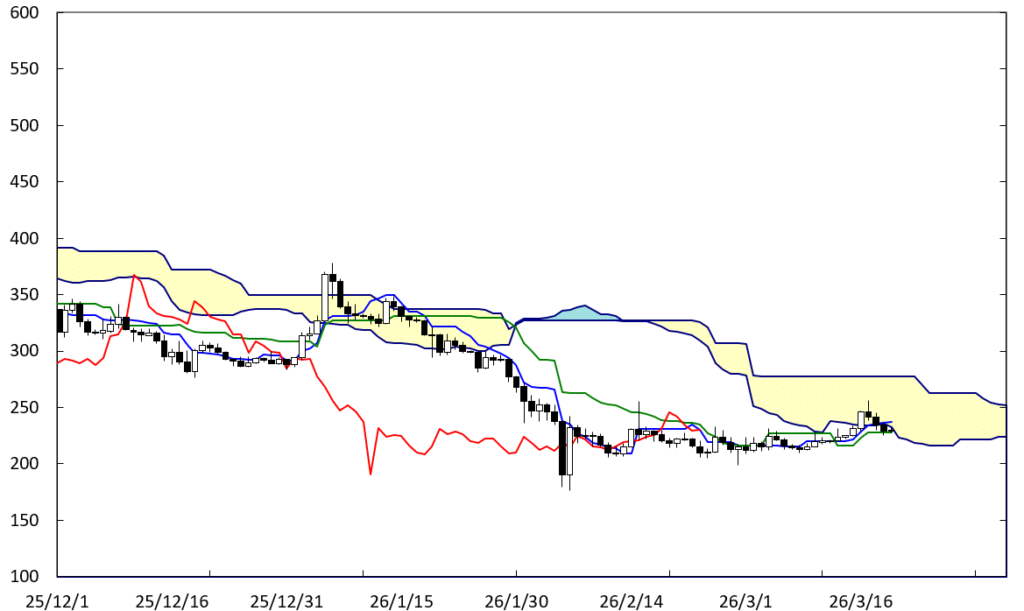 上円尾重たい展開が続いている。ペンタゴンのど真ん中の時間帯が変化日となり再び値を下げていることに加え、ACラインが上値抵抗線として控えている。この場合、200円を割り込む可能性も出てくる。