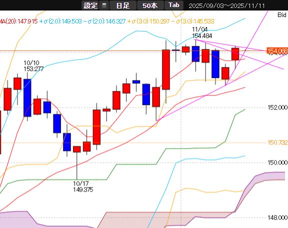 *チャート位置 ボリバン2σ上位 11月高値は154.484