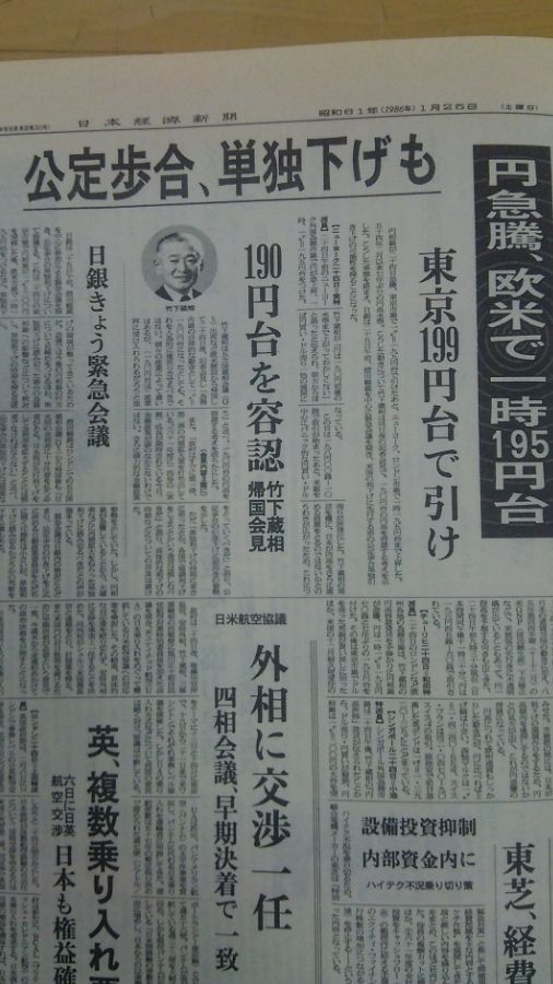 またその当時の経済・物価・給与に戻りたいのだろうか。私は為替を始めたのがプラザ前だから起点は230円くらい。新聞が報じているように270円も、200円割れも円急騰だった。