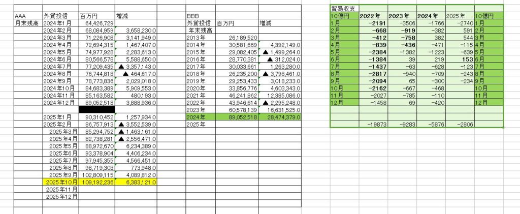 10月も外貨投信は驚異的な伸びで6.4兆円増。貿易赤字が大幅縮小しているが