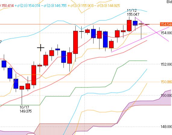 日足、2σ上限到達から反落も中位を割らず。先週末は下ヒゲも長い。11月7日-14日の上昇ラインがサポート。11月13日-14日の下降ラインが上値抵抗。5日線、20日線上向き。