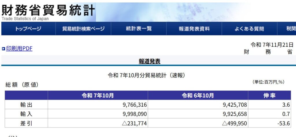 10月貿易統計 赤字縮小も黒字にならない 輸出は伸びる。ただ10月は外貨投信が6.4兆円増加で円安