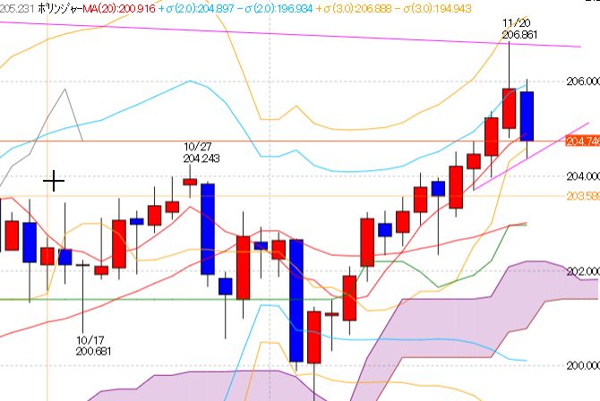 日足、ボリバン3σ上限から反落。11月18日-19日の上昇ラインがサポート。11月20日は上ヒゲが長い。24年7月11日-25年11月20日の下降ラインが上値抵抗。5日線、20日線上向き。