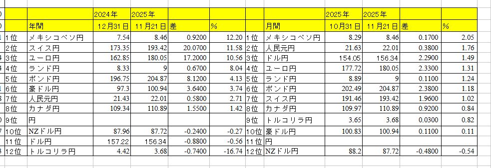 *メキシコ、スイス、ユーロが対円で10%以上の上昇*南アも健闘4位*弱い円と弱いドルで介入か