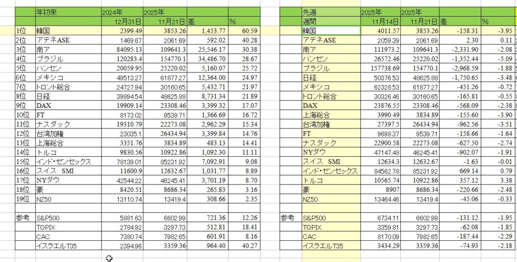 世界株価駅伝、KOSPI独走。日経8位。全市場プラスだが米国はそれほどでもない