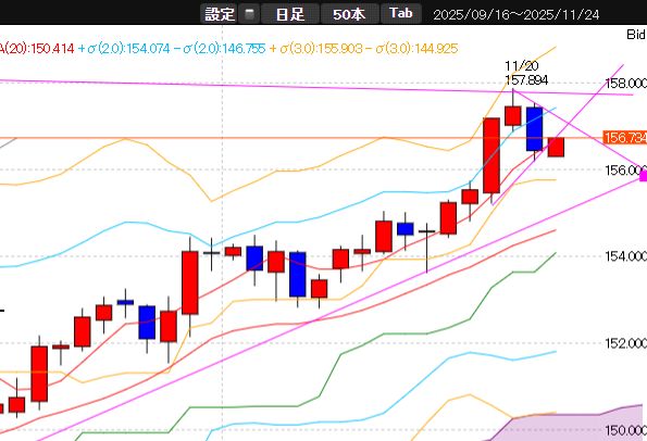 日足、6日ぶり陰線。3σ上限近くから反落。11月19日-21日の上昇ラインがサポート。11月20日-21日の下降ラインが上値抵抗。5日線、20日線上向き。