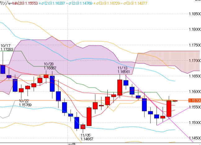 週足、ボリバン3σ上限に到達し反落。11月3日週-10日週の上昇ラインがサポート。5週線、20週線上向き。