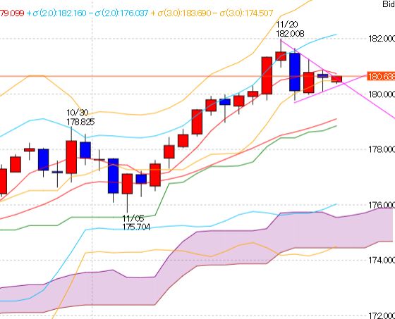 日足、21日は5日ぶりに陰線、大陰線。ただそれ以上は下がらず。11月21日-25日の上昇ラインがサポート。11月20日-25日の下降ラインが上値抵抗。5日線下向く、20日線上向き。
