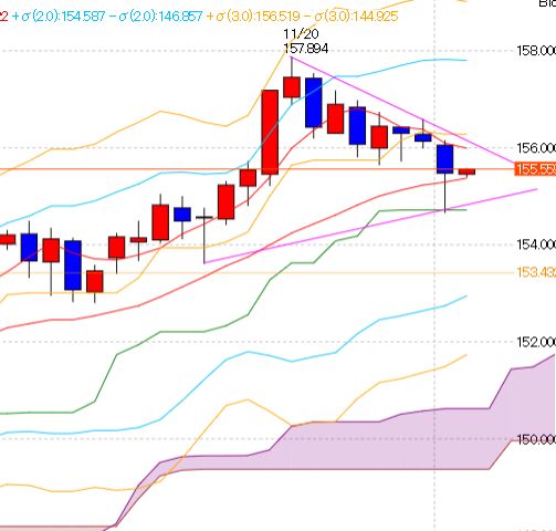 *チャート位置 「下ヒゲでドル円下落一服するか。11月20日-28日の下降ラインが上値抵抗。5日線下向き、20日線上向き。