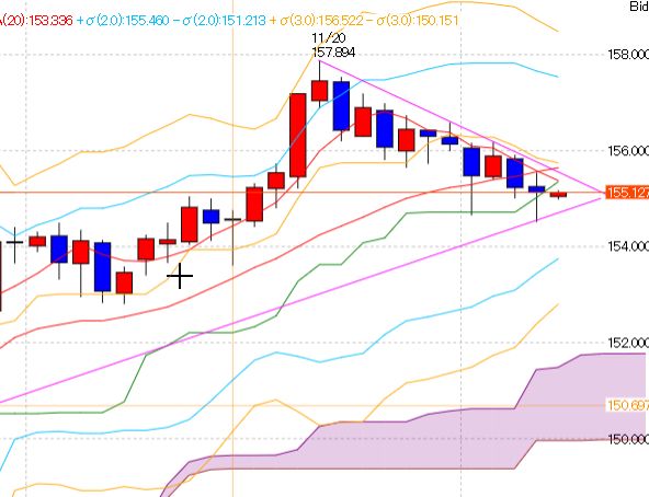 *チャート位置 「じり安続く。ボリバン下位突入。11月20日-28日の下降ラインを上抜けず。5日線下向きで20日線を下抜く。