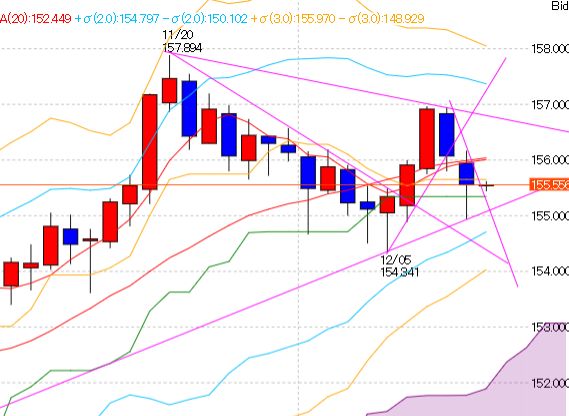日足、154円に突っ込んだが、そこから反発下ヒゲ残す。なかなか154円台の終値にはならない。12月5日-11日の上昇ラインがサポート。12月10日-11日の下降ラインを上抜けるか。5日線、20日線上向き。