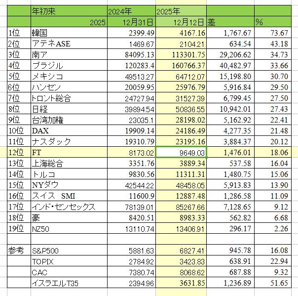韓国KOSPI73.67%高、イスラエルT35は51.65%高。アテネは43.18%高。どんじりはNZ50の2.26%高でした。