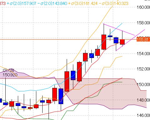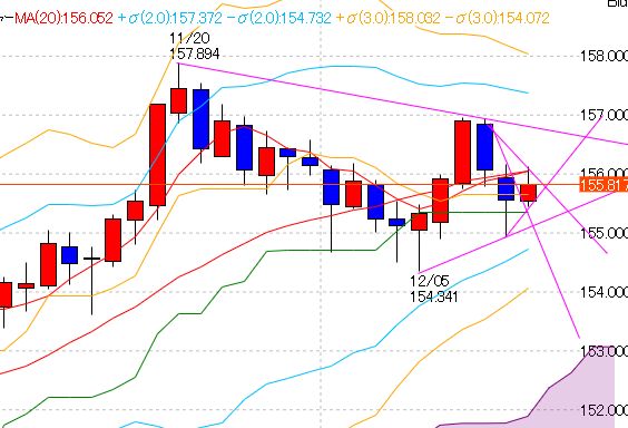 日足、12月12日は前日の下ヒゲもあったが短い陽線で前日の高値を超えず。12月11日-12日の上昇ラインがサポート。12月10日-12日の下降ラインを上抜けるか。5日線、20日線上向き。