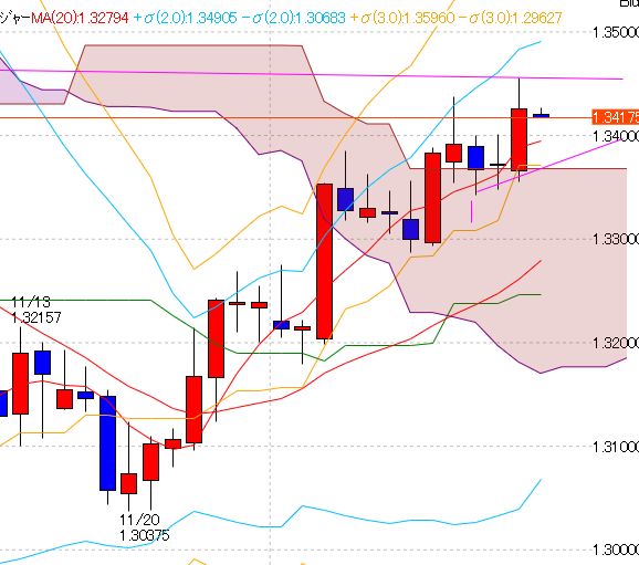 日足、雲上へ、ボリバン2σ上限へ。12月12日-15日の上昇ラインがサポート。10月17日-12月17日の下降ラインが上値抵抗。5日線、20日線上向き。