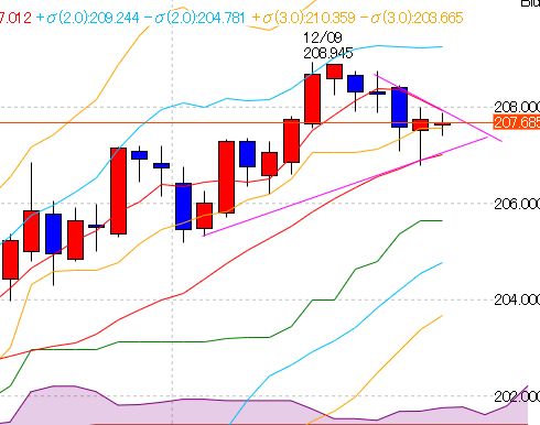 日足、ボリバン2σ上限から反落。5日線下向く。12月2日-16日の上昇ラインがサポート。12月12日-15日の下降ラインが上値抵抗。20日線上向き。