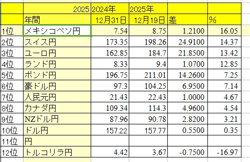 *円がドルに抜かれて11位に後退、ドル円5年連続陽線か。ゴール大手町まで僅かで接戦