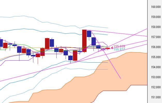 ・日足、じり安でバンド内へ。24日-25日の上昇ラインがサポート。19日-22日の下降ラインが上値抵抗。5日線、20日線下向く
