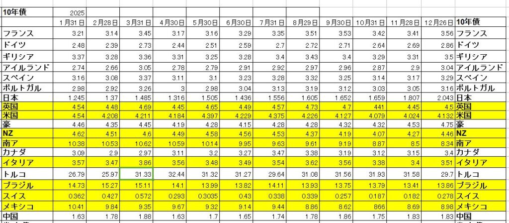 世界の10年国債、利回り上昇と低下は半々。金利と為替はいつもながらあまり関係がないですね