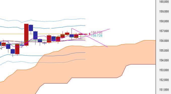 ・日足、中位以上は維持。1月6日-7日の上昇ラインがサポート。1月5日-7日の下降ラインが上値抵抗。2σ上限は157.58、中位は156.22。下限は154.84。5日線、20日線上向き。