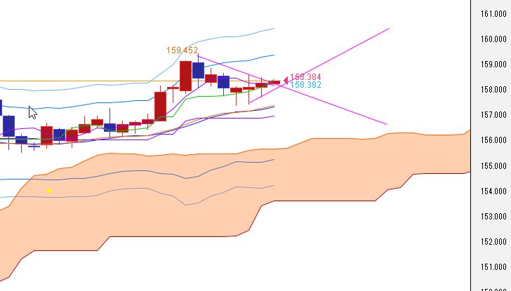 日足、1月20日-21日の上昇ラインがサポート。1月14日-20日の下降ラインが上値抵抗。上抜けるか。5日線下向き、20日線上向き。