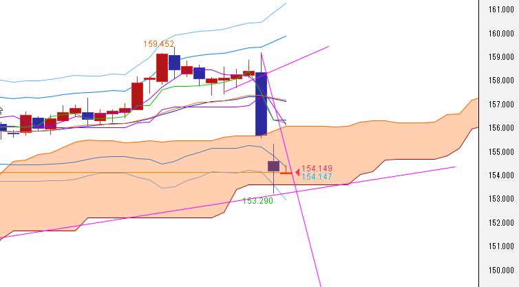 日足、3σ下限、雲中 10月2日-1月26日の上昇ラインがサポート。23日からの下降ラインが上値抵抗。5日線、20日線下向く。