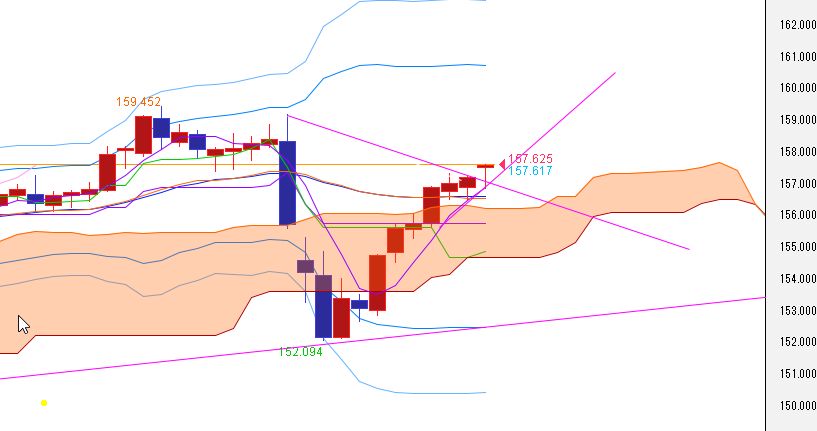 週足、1月26日の下ヒゲの長い週足が効いて、2日週は大陽線。1月26日週-2月2日週の上昇ラインがサポート。1月19日週-2月2日週の下降ラインが上値抵抗だが上抜く。5週線上向く、20週線上向き。