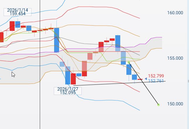 *チャート、ドル円、「ボリバン2σ下限近くへ下落」