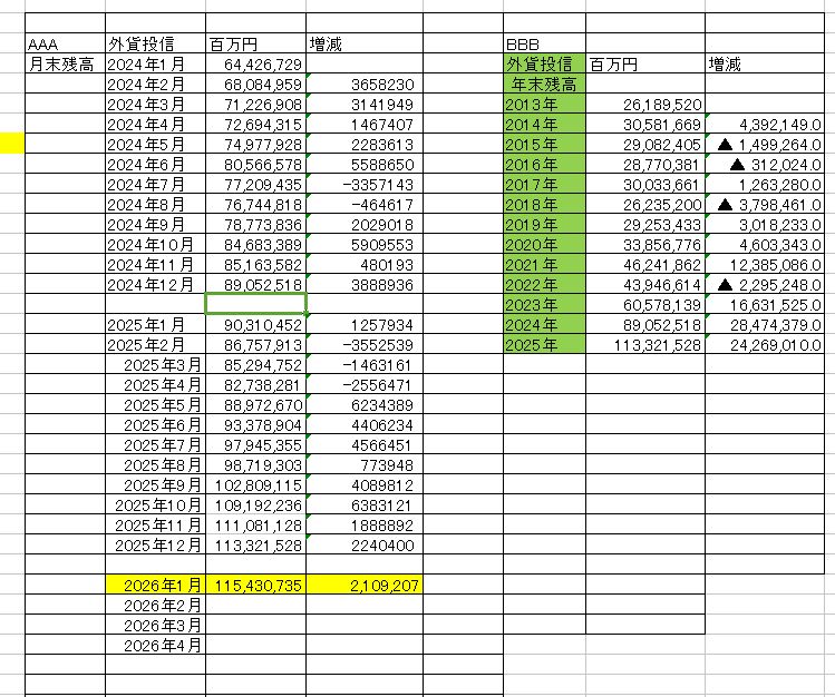 2023年から大きな円安要因となってきた「外貨投信」だが、1月も約2.1兆円増と勢いは変わらない。