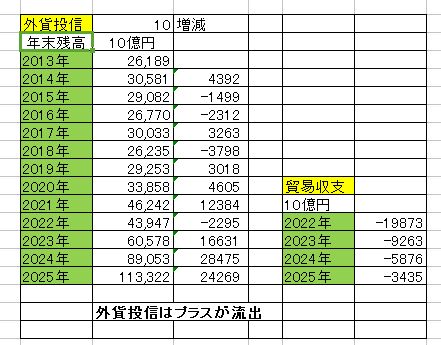 ただ同時に主として(機関投資家も動いているが)政府推奨(金融庁)のNISAによる個人の海外投資の急拡大で貿易赤字を上回る資金が流出している。私は円安の方が税収増、企業収益増がともなうのでメリットが大きいと思うが、財務省・金融庁が自らの政策で円安が進んでいるにもかかわらず、円安を急激だ、投機的だと批判するのはおかしいと思う。むしろ財務省・金融庁の円安政策で日本の景気が勢いづき、消費税減税も行えるようになったと強調したほうが自然だと思う。(表は最近の資金流出の表=外貨投信と貿易赤字) だからと言ってNISAを禁止すると大混乱が起きるのは間違いない。しばし円安での財源拡大を楽しもうではないか。それをインフレ低減に活用すべきだ。(たぶん財務大臣は金融庁も担当する大臣だと思う)
