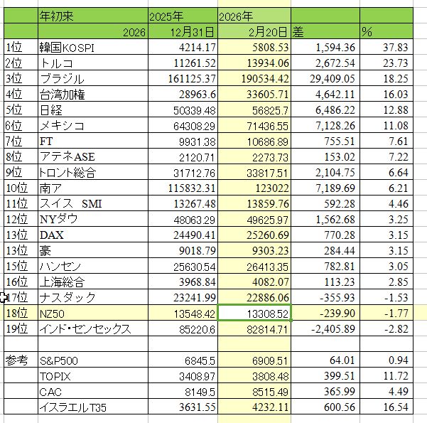世界株価駅伝」韓国独走、台湾も強い(半導体)。 米国を始め欧州、中国は強くはない。台湾TSMCに続き、韓国SKハイニックスも日本進出との観測記事が出たがSKハイニックスが否定。日経は5位12.88%高