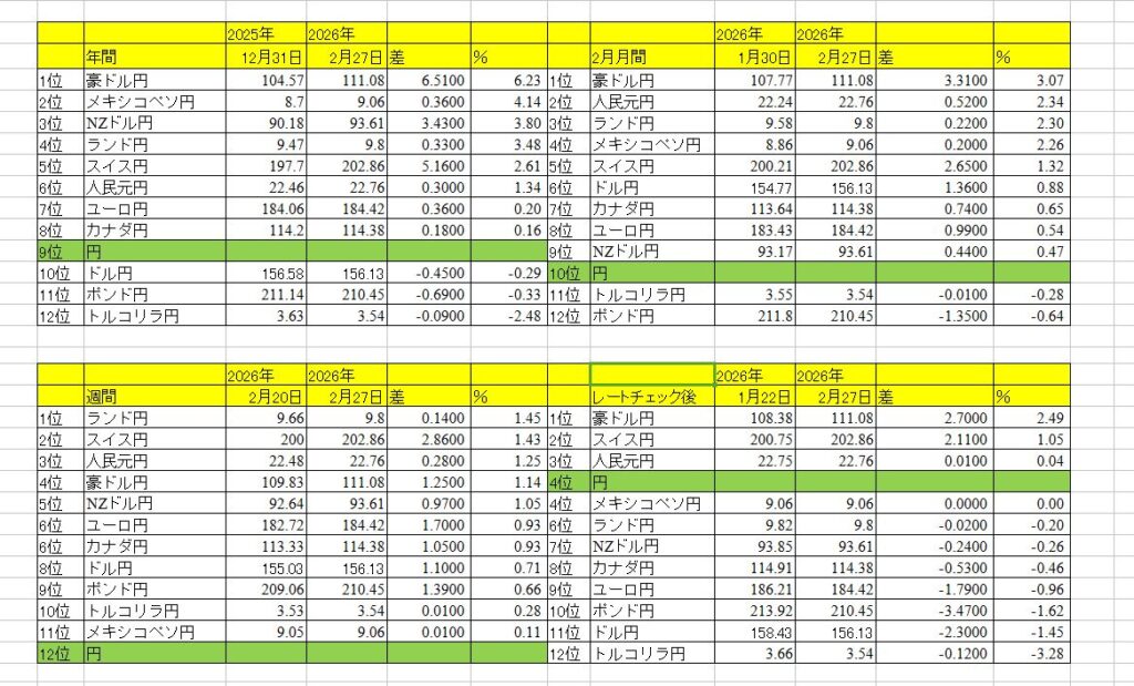 円の成績、年間9位、2月月間10位、先週最下位、レートチェック後4位(主要通貨が低迷の2026序盤)