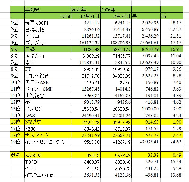 世界の株価、韓国独走。台湾、日本もまずまず。米国低迷。高金利3通貨は株も強い