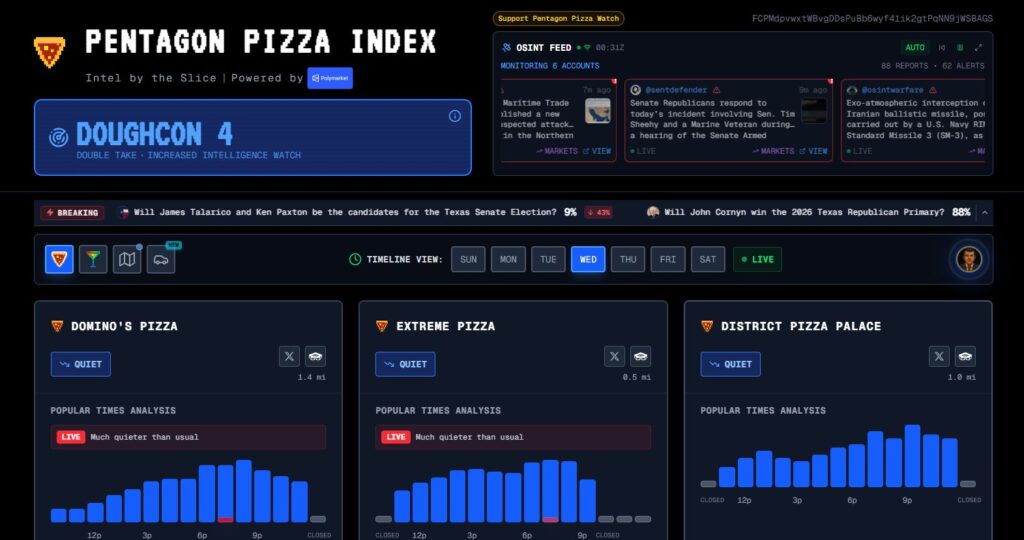 水曜日の夜、ペンタゴン近郊のピザの注文が急増しました。ピザート・ピザ(ペンタゴンから2.2マイル)では注文が326%増加し、パパ・ジョンズ・ピザ(2.3マイル)では208%、エクストリーム・ピザ(0.5マイル)では127%増加しました。水曜日の夜、ドーコンの警戒レベルは4に設定されました。