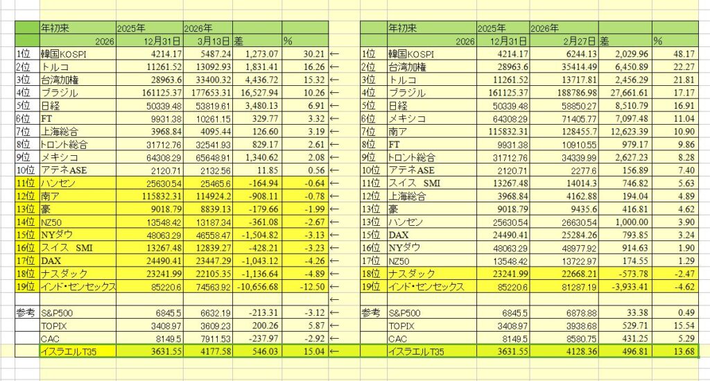 上昇したのはイスラエルとここには掲載していないオマーンでどちらも中東市場でした。アフリカの酋長のような米大統領へ「NO」と言えない世界と民主党。イランのように政権奪取の爆撃をアメリカには出来ない。
