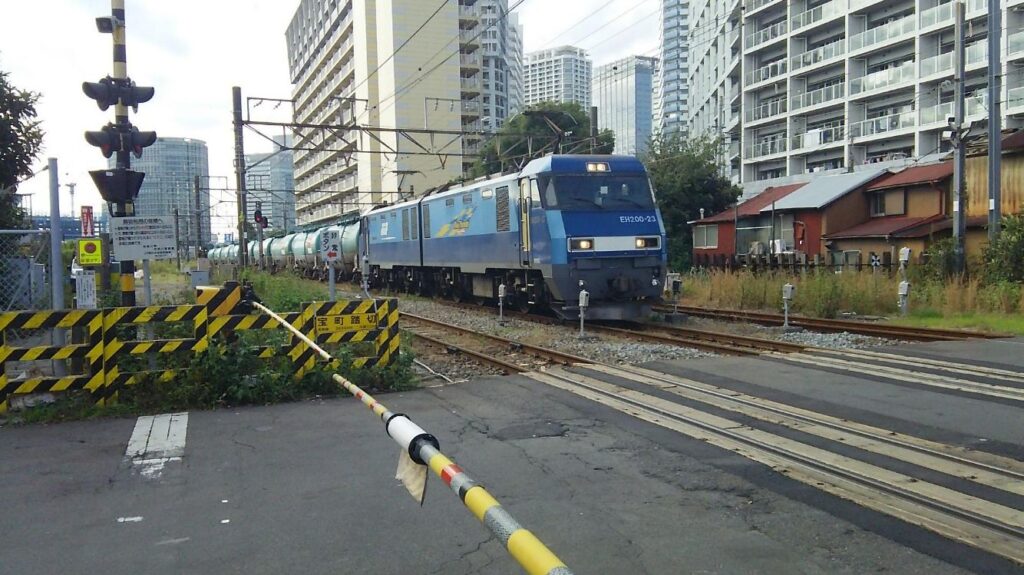 汽車では無理なのか。エネオス石油輸送、踏切に出川さんの海苔屋さんがあります。中国は西安ーミラン鉄道がある。(横浜駅近くを走るエネオス号)