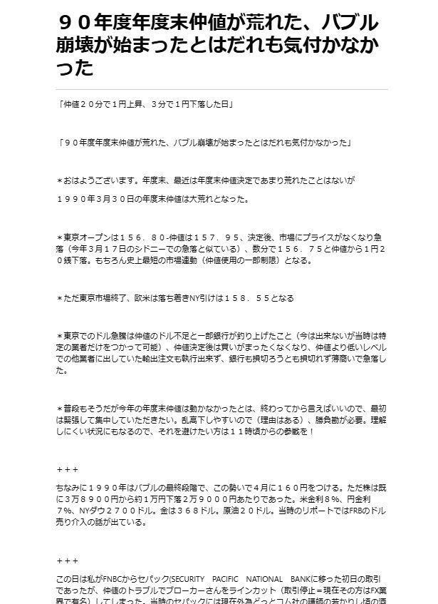 最近の年度末仲値は落ち着いている。今回の例は最も凄まじきものであるが、当時の年度末仲値相場は以下のように恐怖であった。例は人為的にいたずらをした銀行と、東京には珍しい仕手筋(今はいない)が偶然組み合わさったものであった。また当時の環境はFRBが東京で直接ドル売り介入をしたり面白いものであった、日経3万8千円、NYダウ2700ドル、金368ドル、原油20ドル時代。円金利7%、米金利8%
