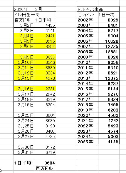 3月は1日平均36.84億ドル(銀行間ブローカー通し)で2月の38.32億ドル、1月の43.43億ドルを下回った。1日100億ドルあったころが夢のようだ。3月はトランプ戦争で株や債券は下落中心で大きく動いたが