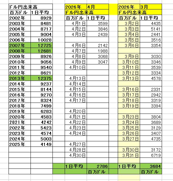 介入はよく激しいボラティリティーを鎮めるためと言われるがそうならばやる必要はまったくない。円高デメリット救済、円安メリット減殺という目的なら大臣の好みなので、結果はどうなろうと知ったことではない。1日200億ドル程度の介入をやればデイトレーダーは万歳三唱か(表は2000年の出来高推移位と最近の出来高、ドル円日足)。出来高30億ドル台は昭和後期、ただプラザ合意直後で年間40円ドル円下落が3年続いた。出来高とボラは関係がない。ボラを生まないのは実需と資本需給が拮抗しているからだろう。投機筋は出来高が少ないしまったく相場との関係はないが、あまり理解されていないようだ