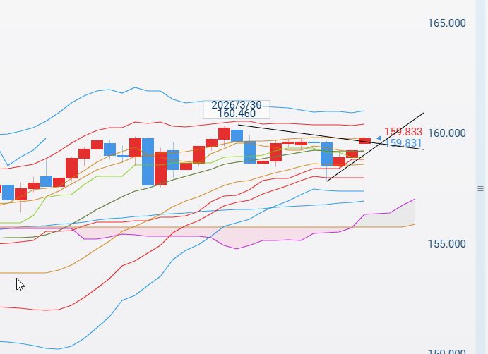 *ドル円テク=4月1日-2日の上昇ラインを下抜け下落、2σ下限(158.03)で反発。まだボリバン下位、中位は19.21。5日線、20日線下向く