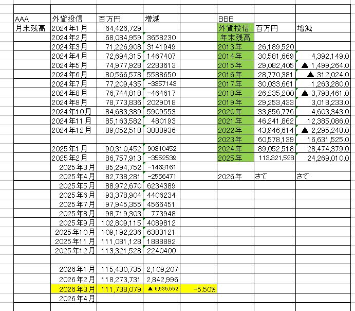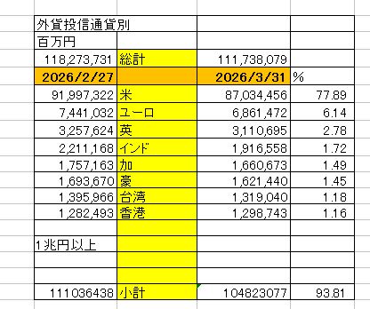 *3月の外貨投信残高(オルカンを含む)が急落、前月比6.5兆円減少、5.5%減少