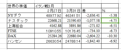 米株が約5%、英株が6%、独株が10%安の3月であったのでそれが影響している