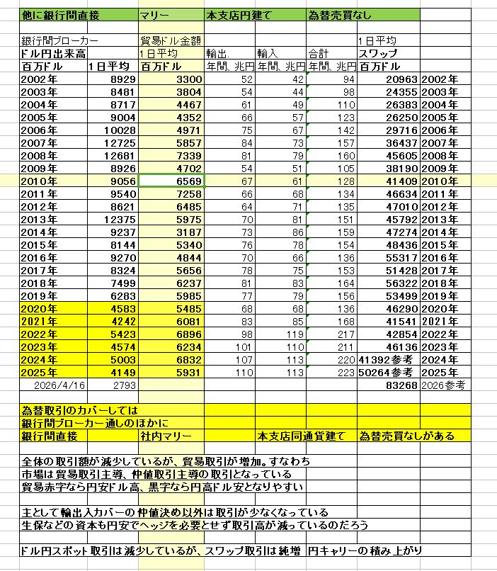 「21世紀のドル円為替取引の傾向」減少中の出来高、増加中の貿易額を調べてみました。また純増のスワップ取引出来高も付し、最近のドル円の動きを考察しました。貿易次第、仲値次第、投機色なし