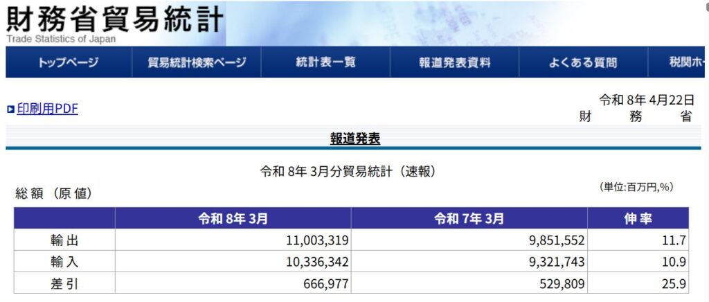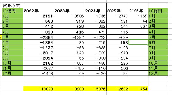 中東からの輸入は航行できないので減少(輸出も減少だが)。円相場の均衡要因。あとはもう一つの円安要因の外貨投信残高が気になる(松川議員はオルカン非課税をやめろといっている)。まあ変則トランプなのでいろんな経済指標も変則になる(政府機能停止、関税、戦争による原油高、意味追い出しなどなど)