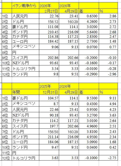 「月末」(表はイラン戦争以降と年初来の通貨順位)