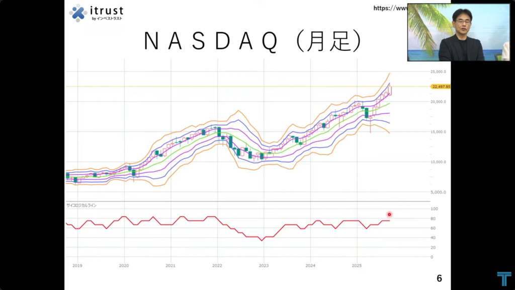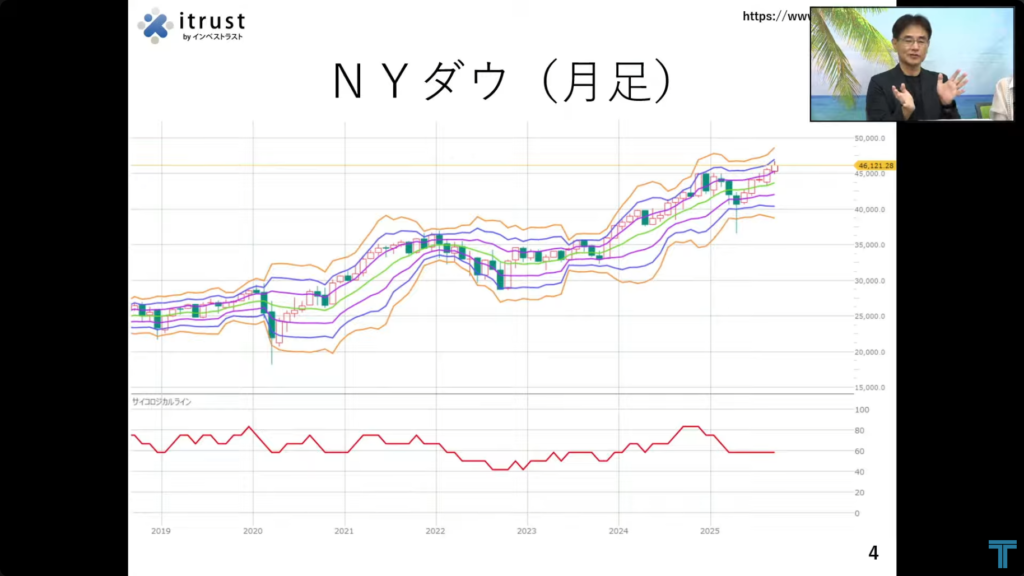 まず米株。NYダウはパラボリック陰転で『ひと息』のサイン。ただ月足ボリンジャーでは+1σ上で推移=押し目は拾われやすい流れ。上は48,000ドル近辺が年内メドかも、という見立てでした。