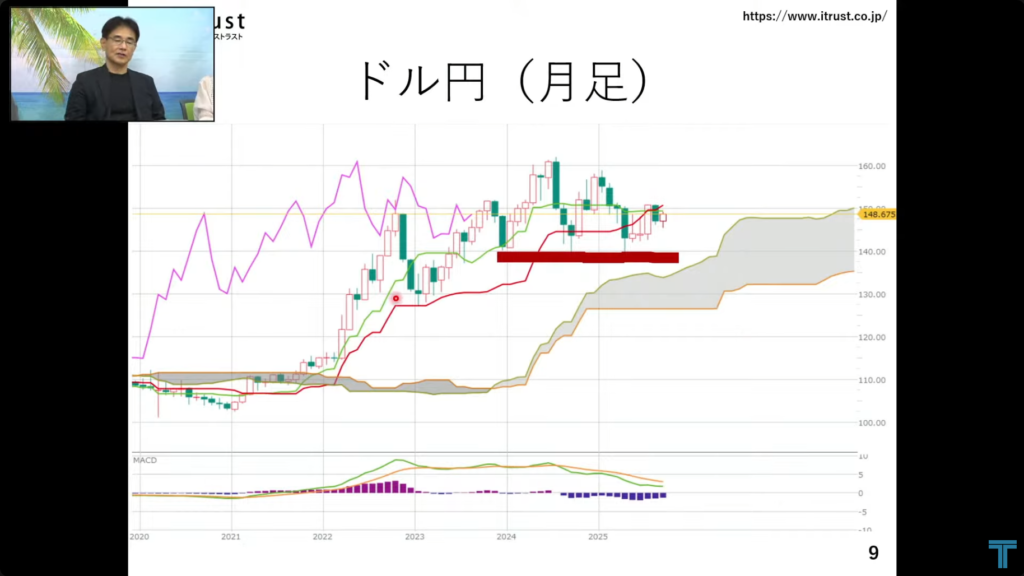 一目均衡表の遅行スパン/雲でみると、中長期はなおドル高優位が続きやすい配置。ただ週足は「ねじれ通過」局面で方向出やすいタイミング。