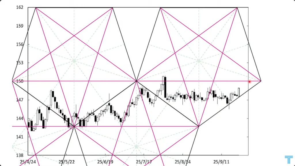 ペンタゴンでは150円が明確な上値抵抗。ここを上抜けると『横にペンタゴン追加』で強気継続。逆に跳ね返されると調整色が濃くなるかも。トリプルトップも頭の片隅に。