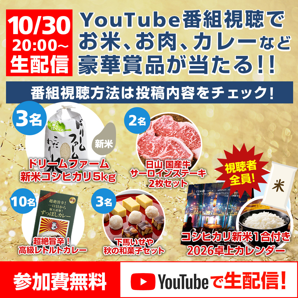番組後半にはお米やステーキなどが当たるプレゼントコーナーも用意されてますので、そちらもお楽しみに!